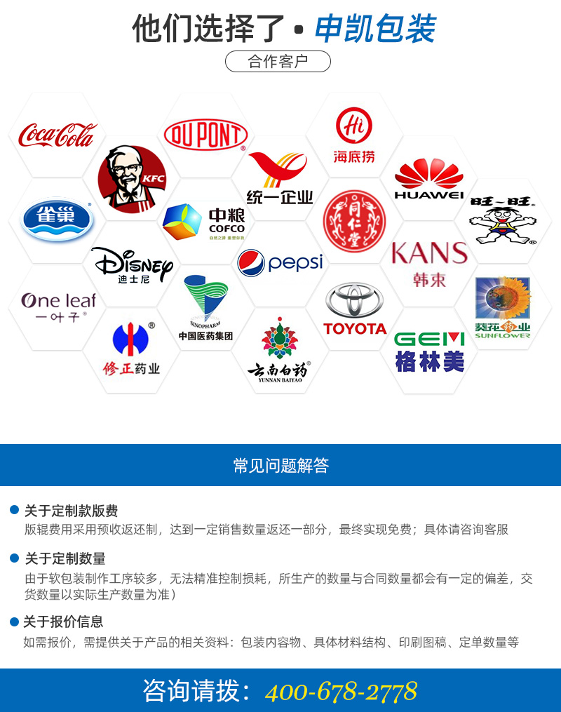 只要用了我們的包裝,不管是包裝膜的問(wèn)題還是包裝機(jī)的問(wèn)題,都是我們的問(wèn)題!只要有質(zhì)量問(wèn)題,馬上召回,不管有多遠(yuǎn)!