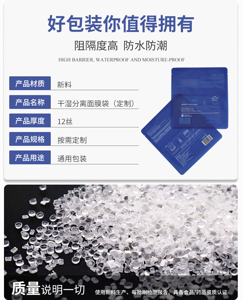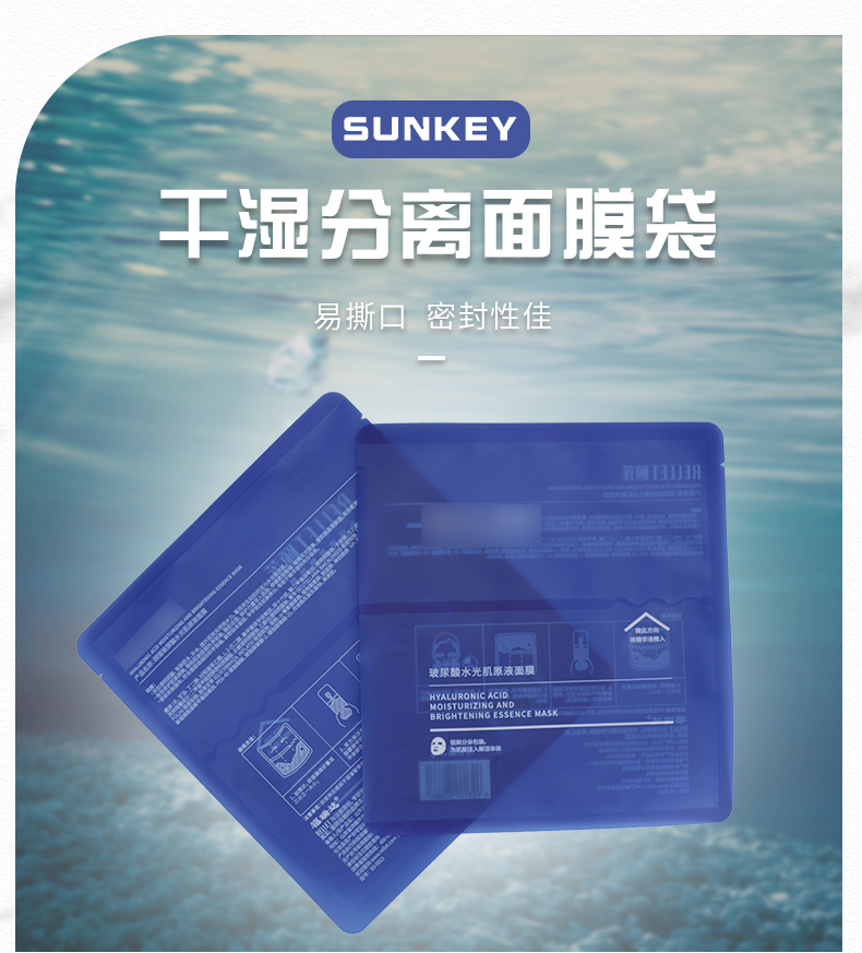膜液分離的干濕分離面膜袋技術可以,使精華液可以獨立包裝,保證穩定性更優的情況下,還能減少某些添加劑的使用。面膜在使用前十幾秒才解鎖“浸泡”,既杜絕面膜紙中化工成分的析出,又能最大程度地保證活性成分的被最大程度地吸收,新鮮程度是傳統浸泡式面膜無法比擬的。